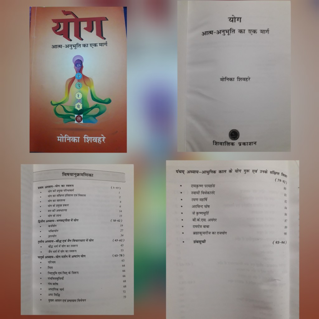 यह पुस्तक मेरी सहकर्मी और मित्र मोनिका शिवहरे ने बी•ए• के SEC पेपर ‘योग फिलोसोफी ‘के स्लेबस को ध्यान में रखते हुए लिखी है।लेखिका ने पुस्तक में योग से जुड़े अनेक विचारों और पहलुओं को गहरायी के साथ सारगर्भित तरीके से सामने रखा है। पुस्तक की लम्बाई (पेज़ संख्या) सीमित होने से विद्यार्थियों के लिये इसे एक समय सीमा में पुरा पढ़ जाना भी आसान है। लेखिका के शब्दों में कहुँ तो इस पुस्तक क एक द्वित्तीय लक्ष्य योगाभ्यास के एकमात्र उद्देश्य ‘आत्मानुभूति ‘को स्पष्ट करना भी है।